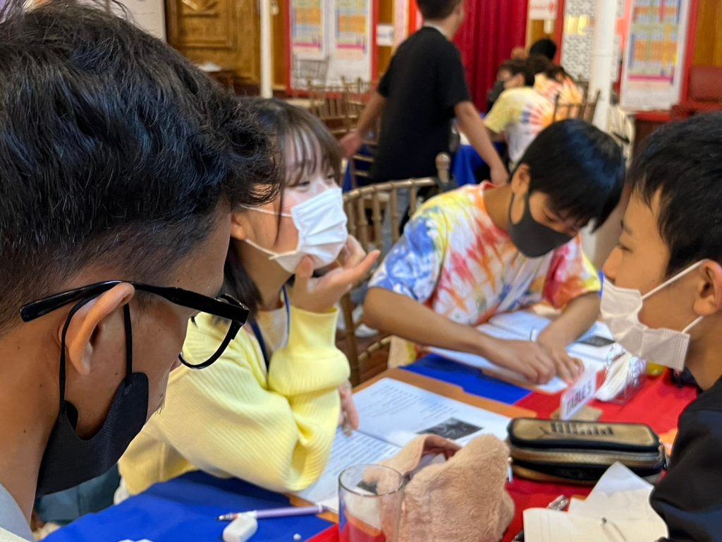 数日前の理科の実験教室「Tie Dye」で染めたTシャツが完成しました!自分で作ったカラフルなTシャツを着て集合写真を撮りました!みんな思いもよらない柄になっていたり、想像よりもかわいいシャツになっていたりで大興奮!