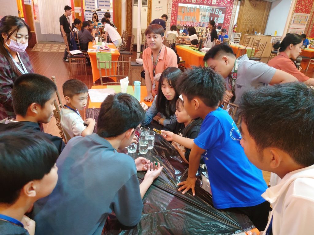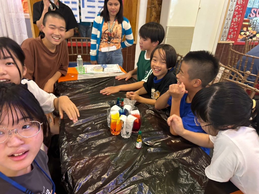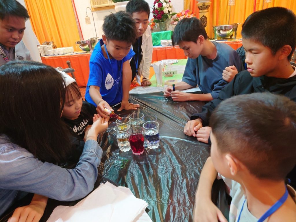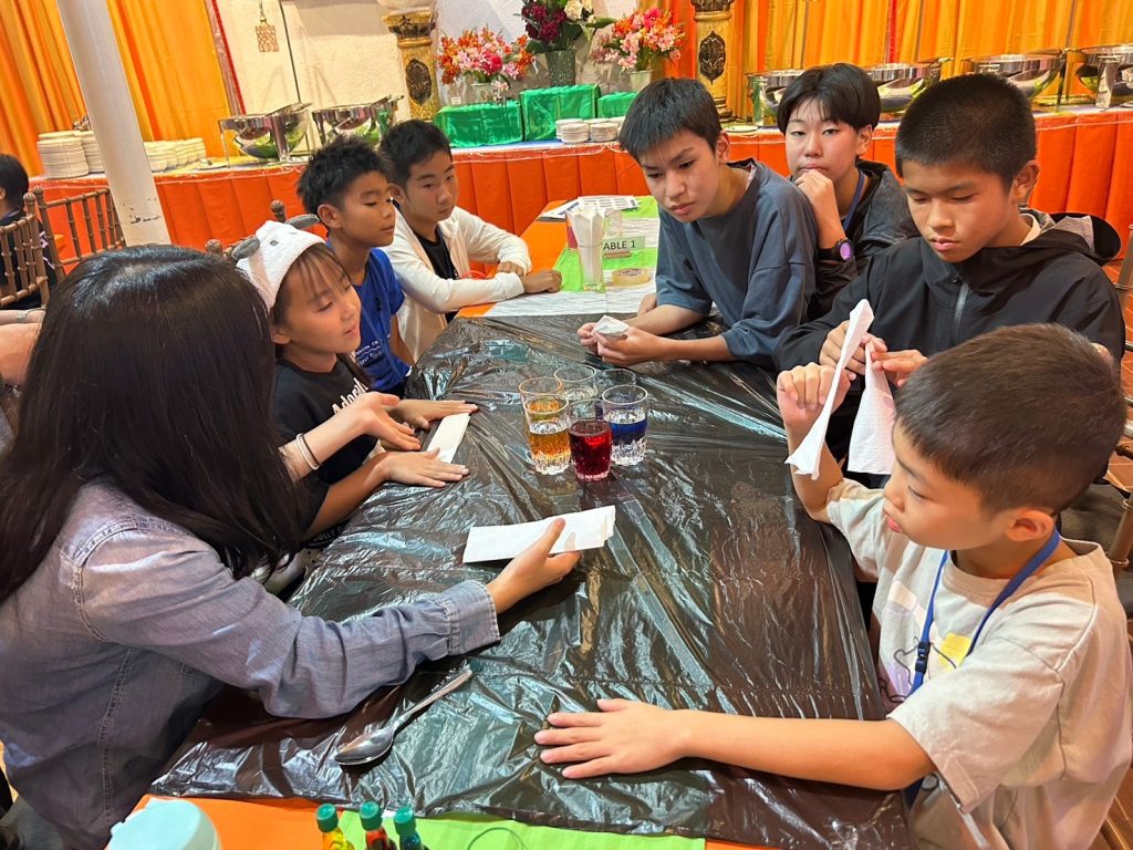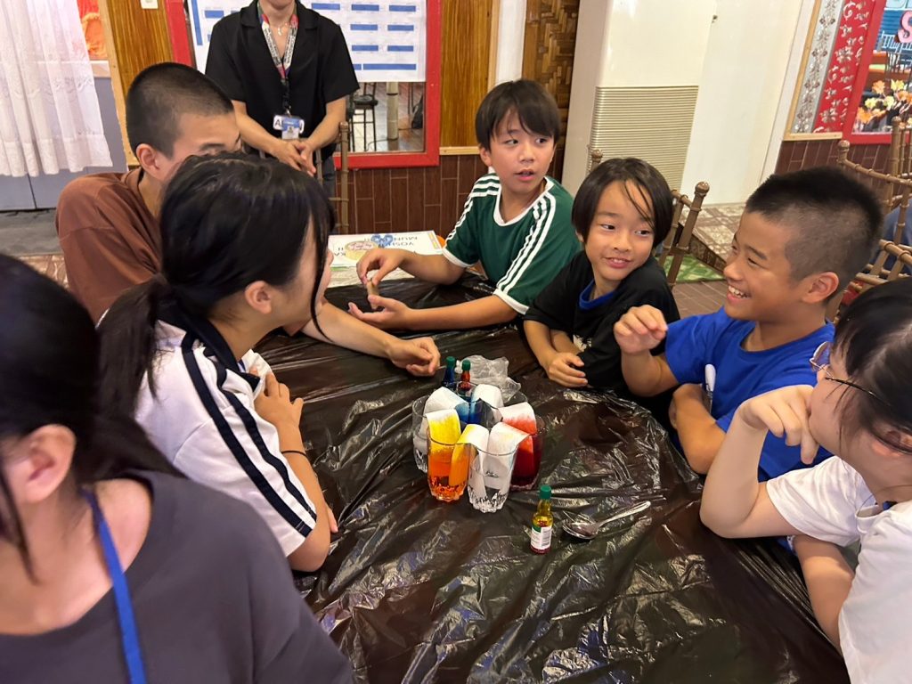 小中学生には理科の実験教室(Science Class)が午後にあります。実験教室では普段とは違った単語を使うので、初日の今日は簡単なWalking WaterとRising Waterという実験をしました。色水を作るための食紅で手が染まって楽しんだり、どの班が一番良い実験結果を出せるか競争をしたりしてみんな大はしゃぎです!