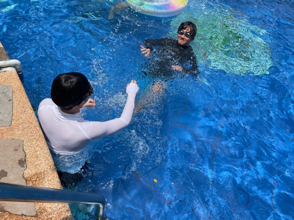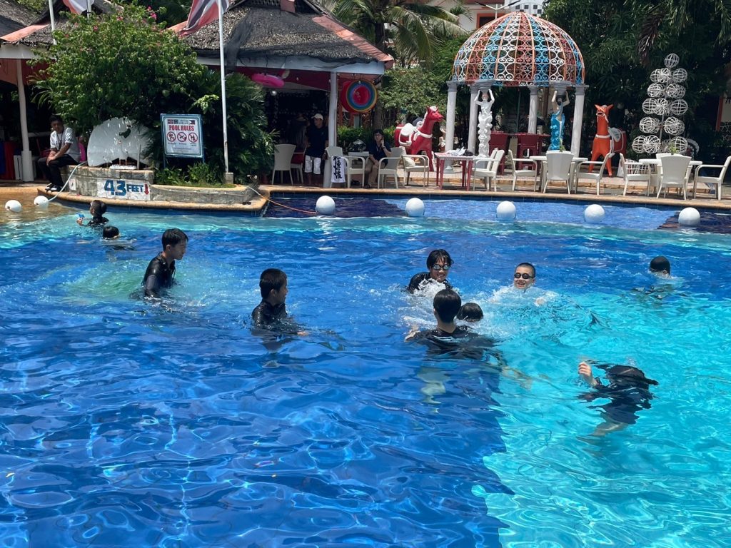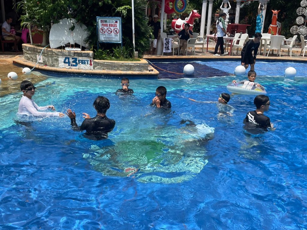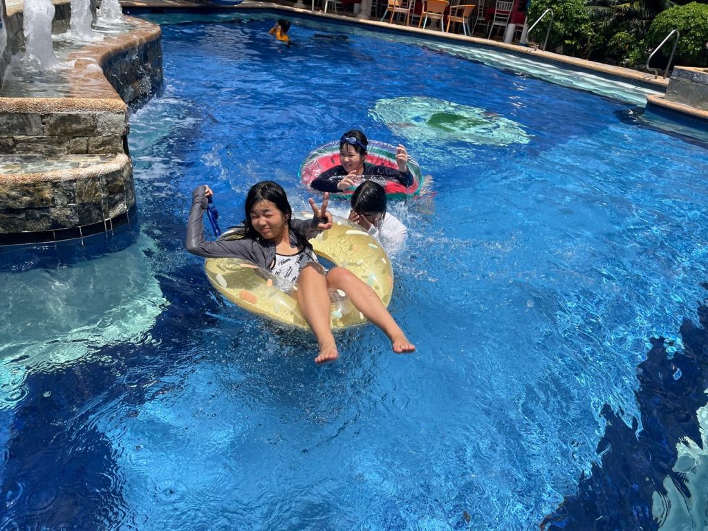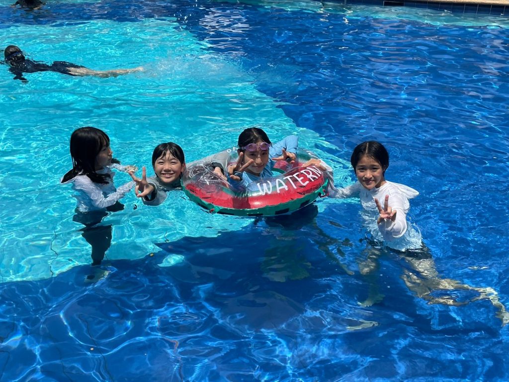 昼休憩では、昼食をとったり、プールで遊んだり、部屋でゆっくりとすごしたりしています。今日はプールに入るが生徒が多かったようです!