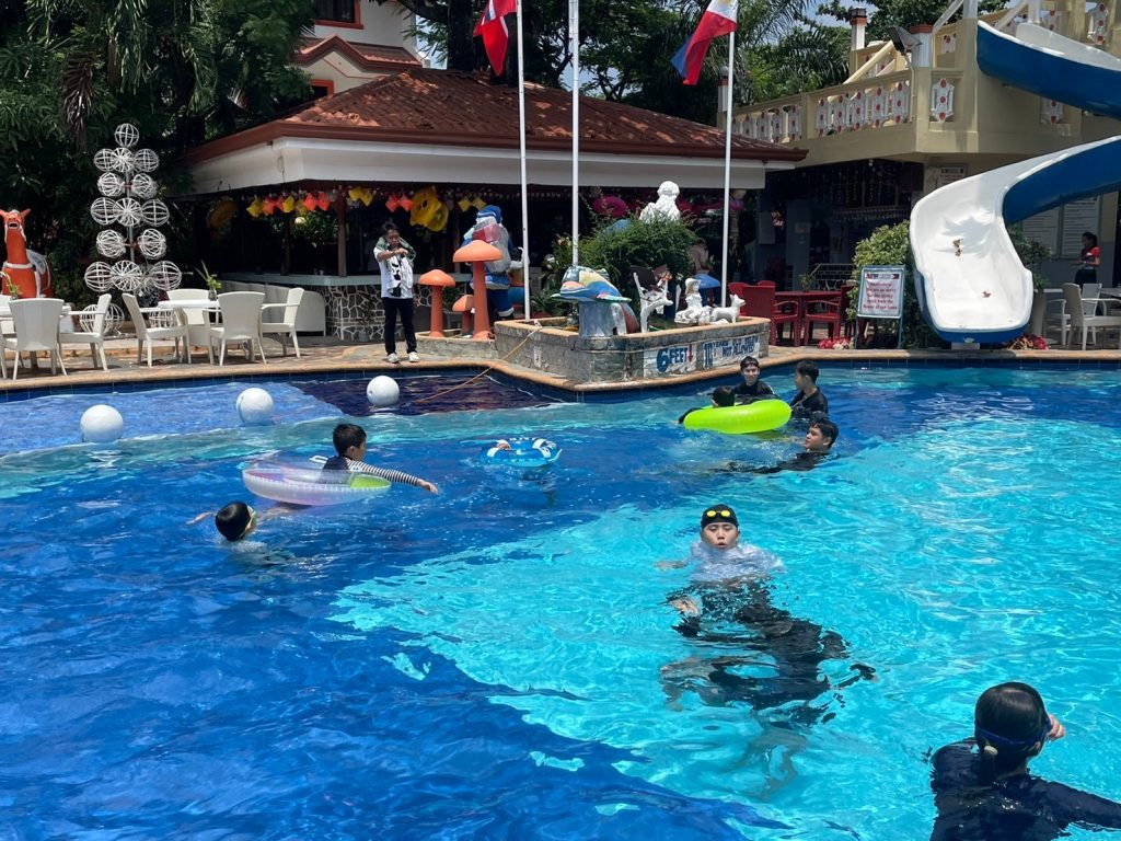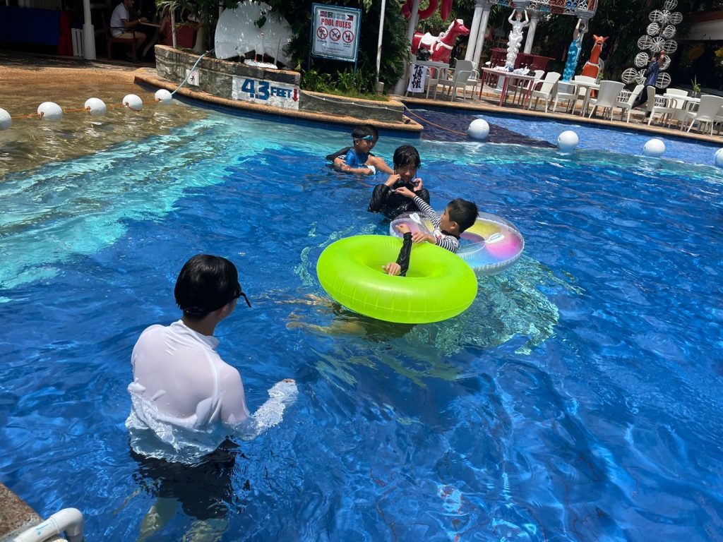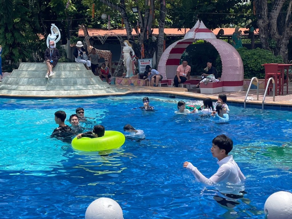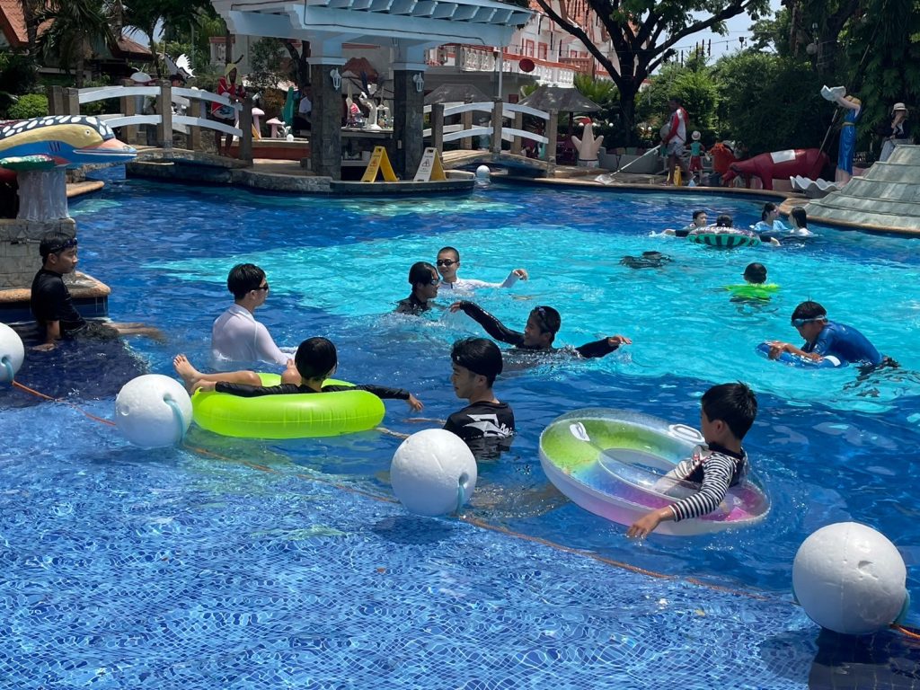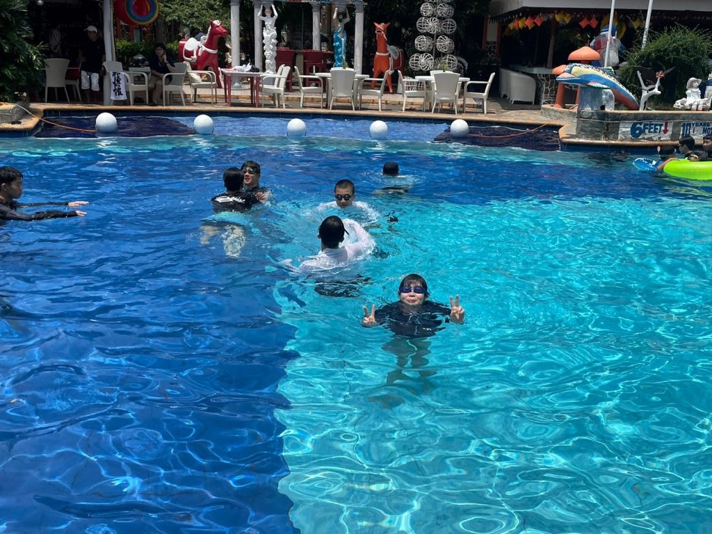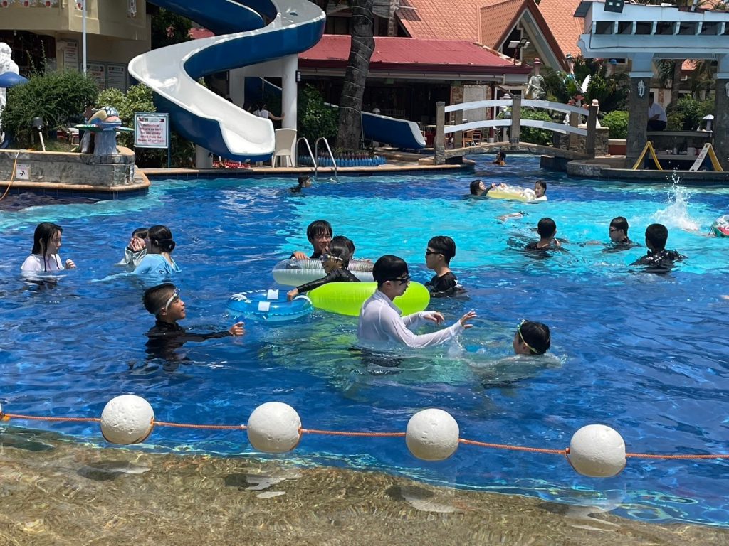 昼休憩では、昼食をとったり、プールで遊んだり、部屋でゆっくりとすごしたりしています。今日はプールに入るが生徒が多かったようです!