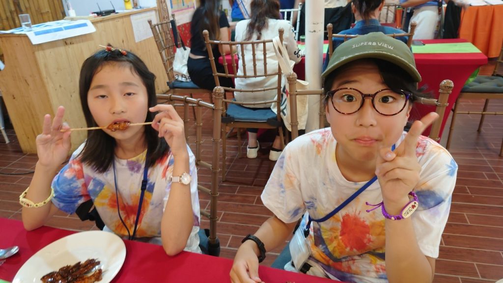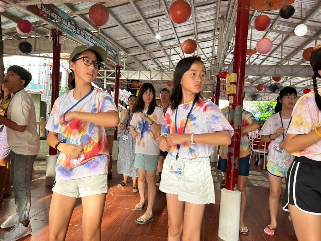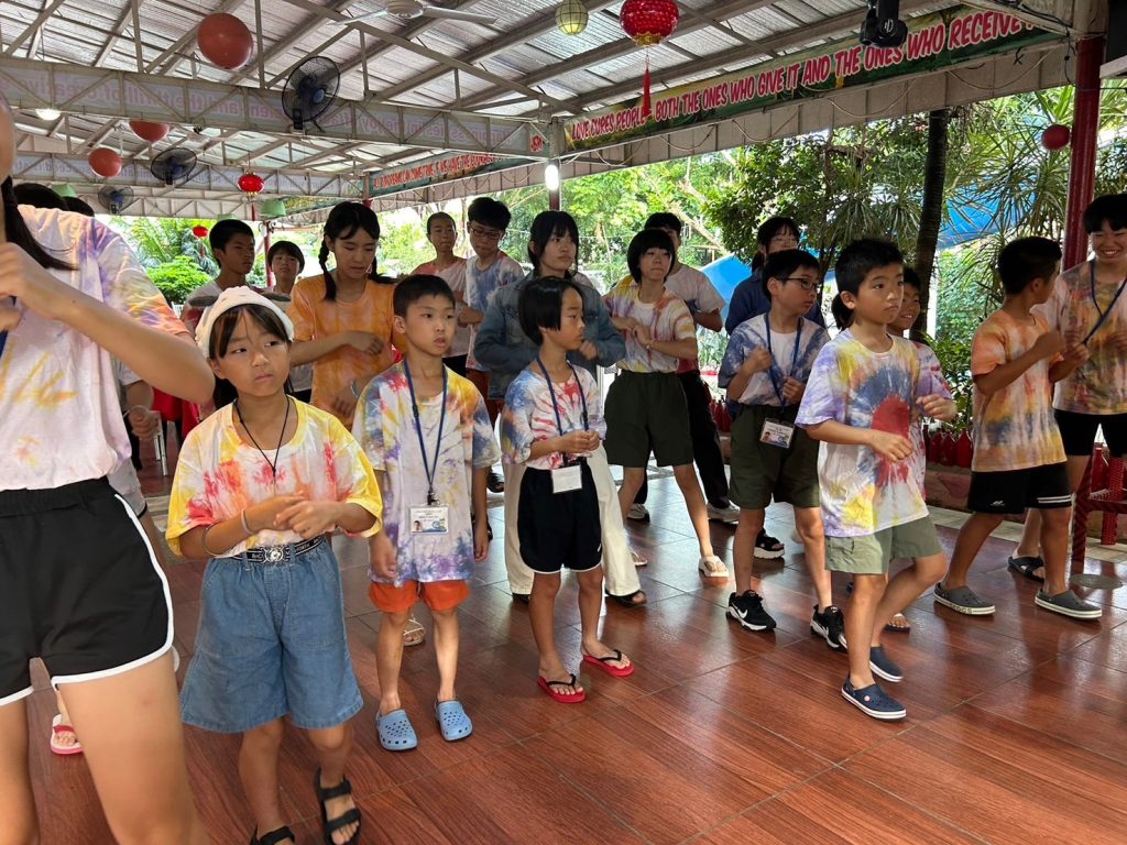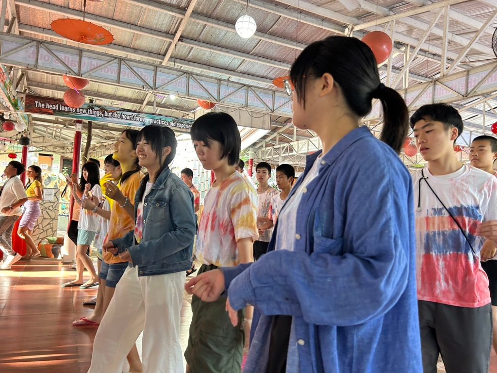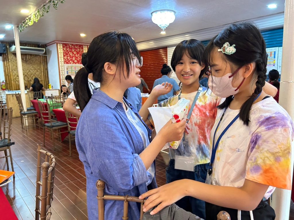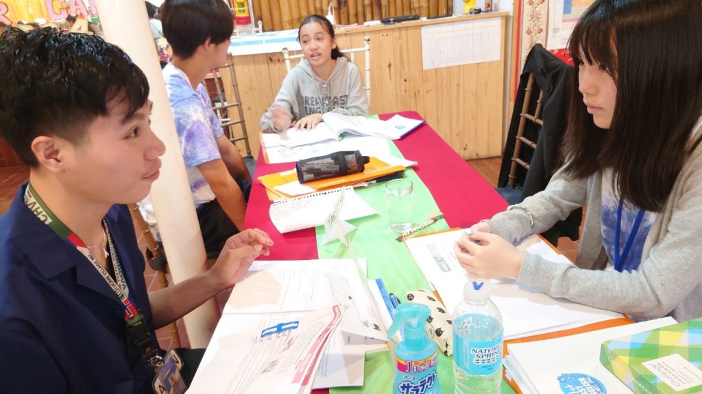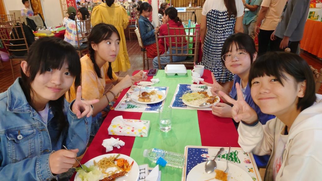 みんな年齢の分け隔てなく交流しています。市内観光で購入したアクセサリーを身に着けている生徒も多く、自慢げに紹介してくれました。