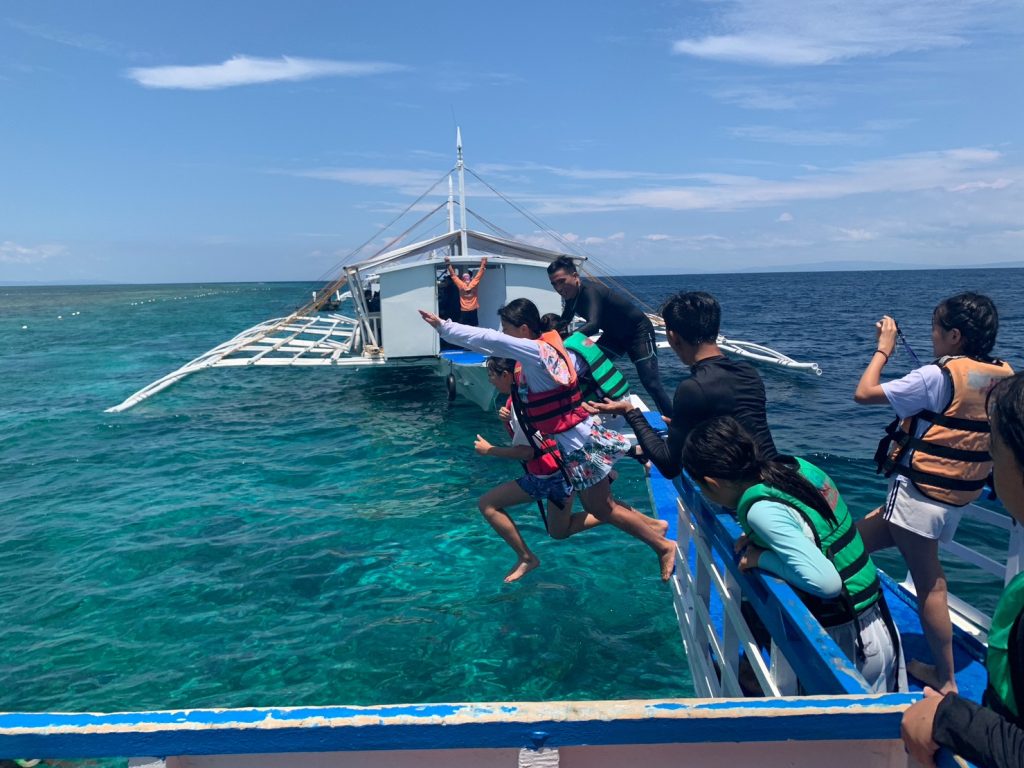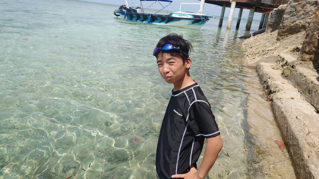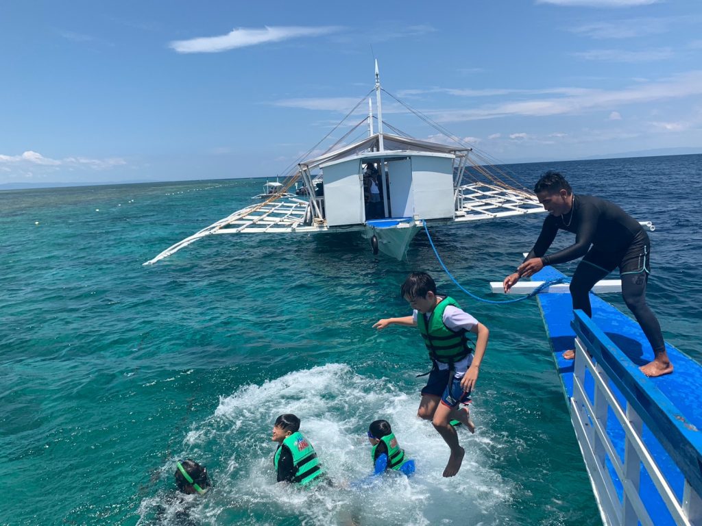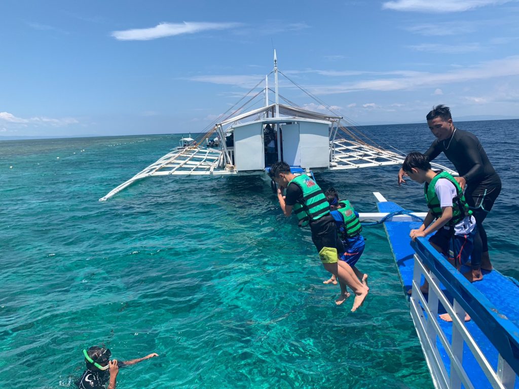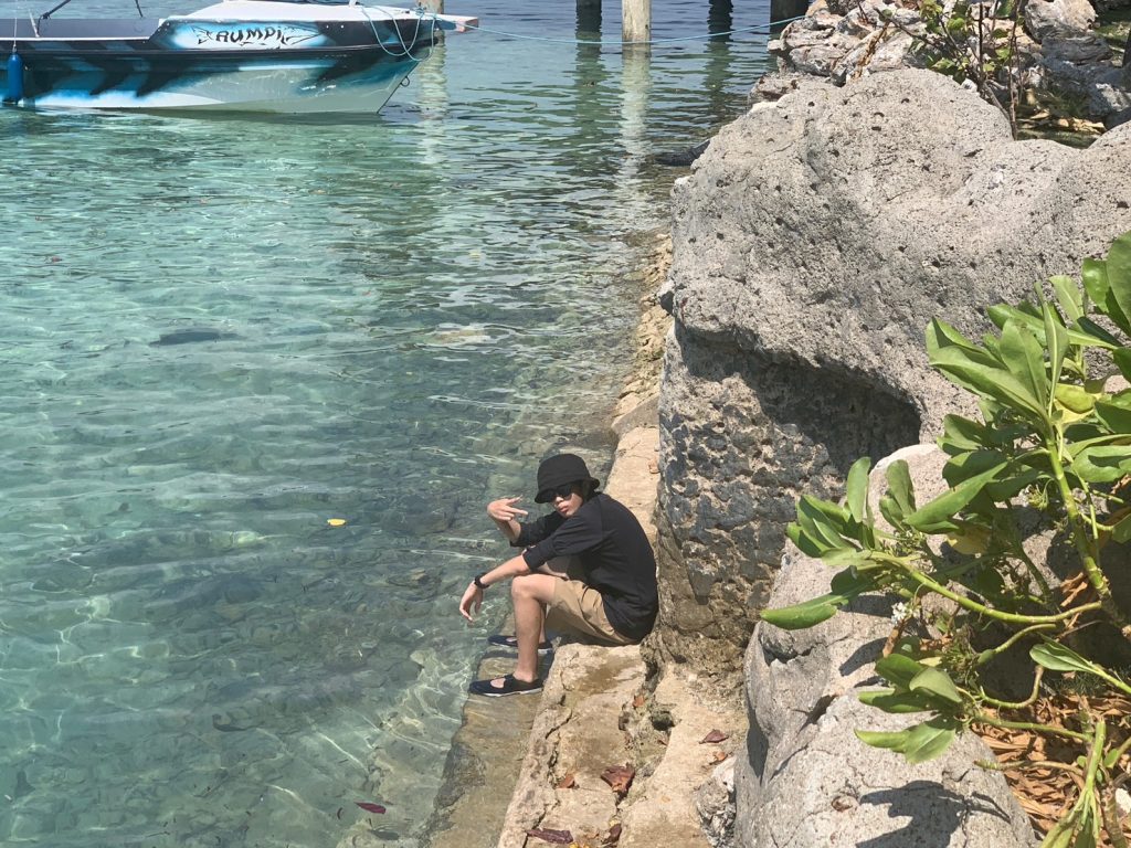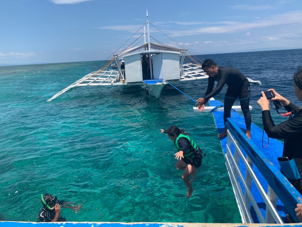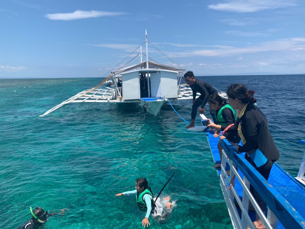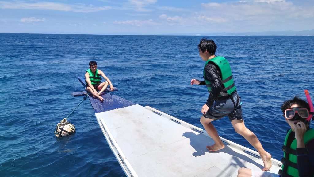 最初はヒルトゥガン島でシュノーケリングになります。島に上陸するわけではなく、ヒルトゥガン島付近にとまったボートから海に入ってシュノーケリングを楽しみます。魚に餌をやったり、ボートから海に飛び込んでみたり、みんなおはしゃぎです!