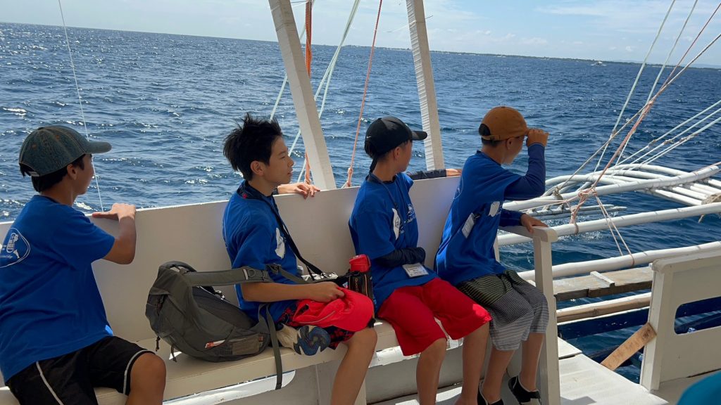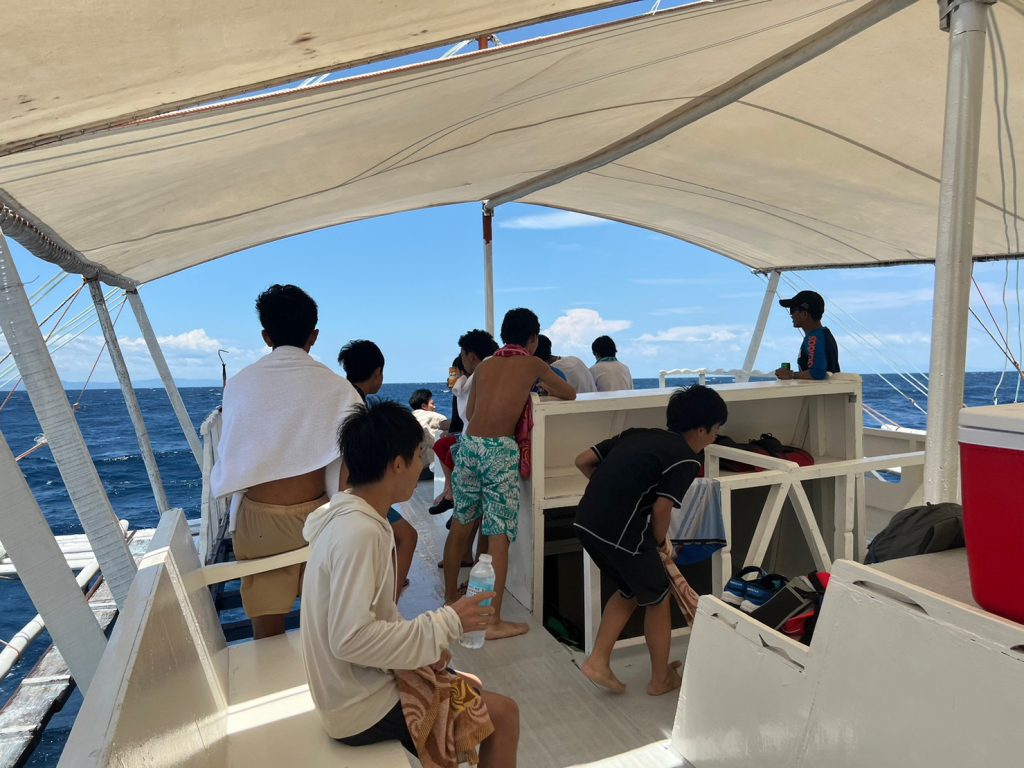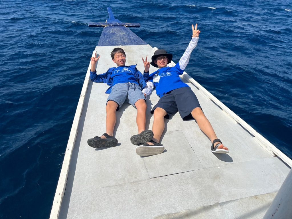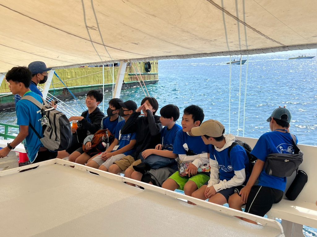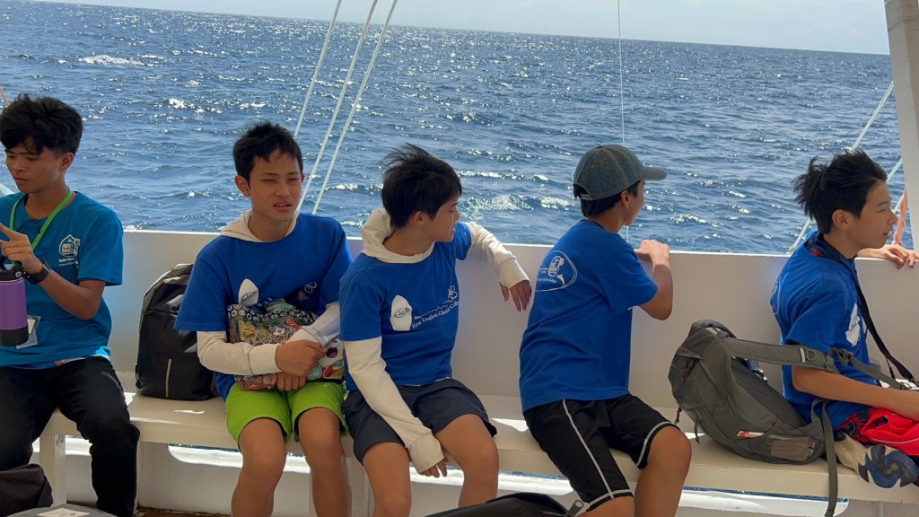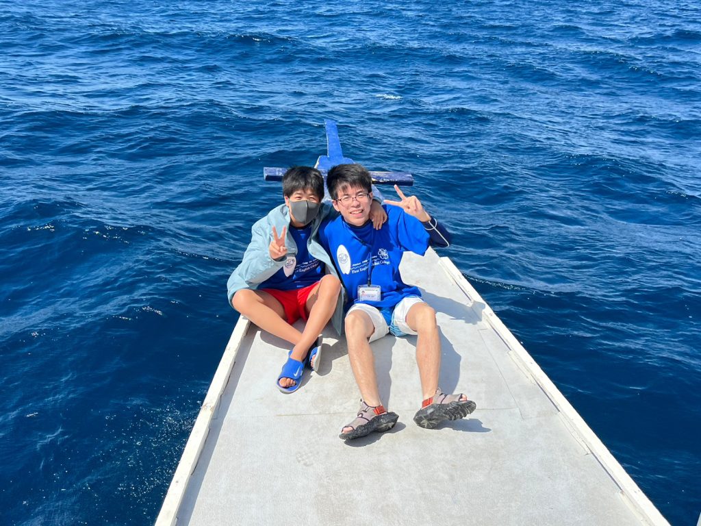 港からの移動はバンカーボートという独特の形をしたボートを使います。今日は波があるので、船がぴょんぴょん飛び跳ね、水しぶきがボートの中まで入ってきました。その揺れに最初は怖がる生徒もいましたが、慣れてくると揺れや景色を楽しむことができました。