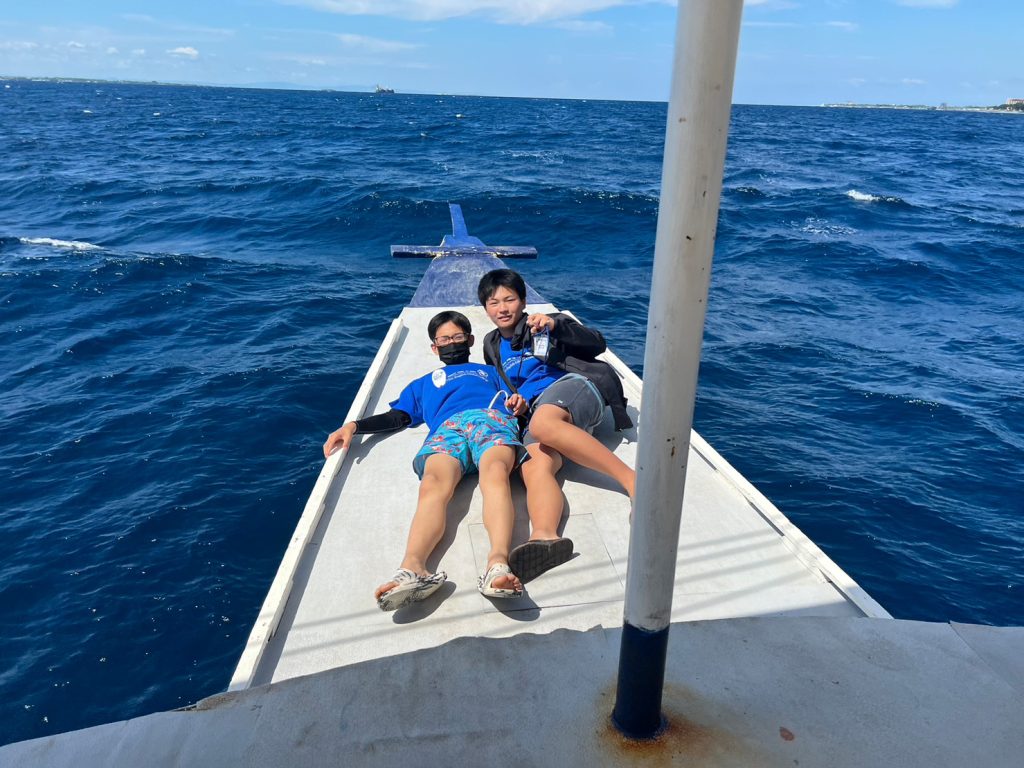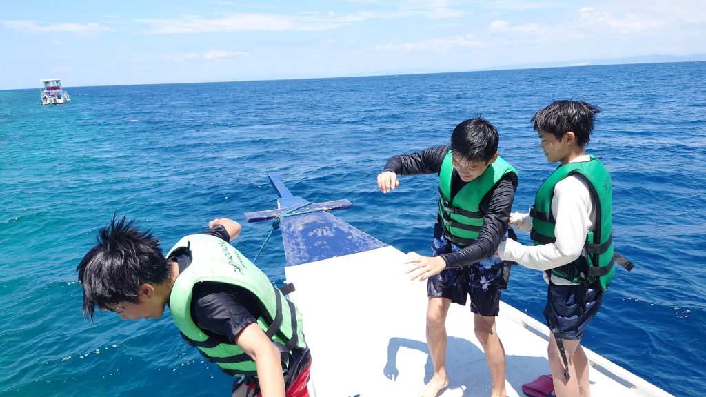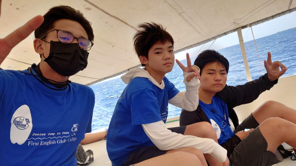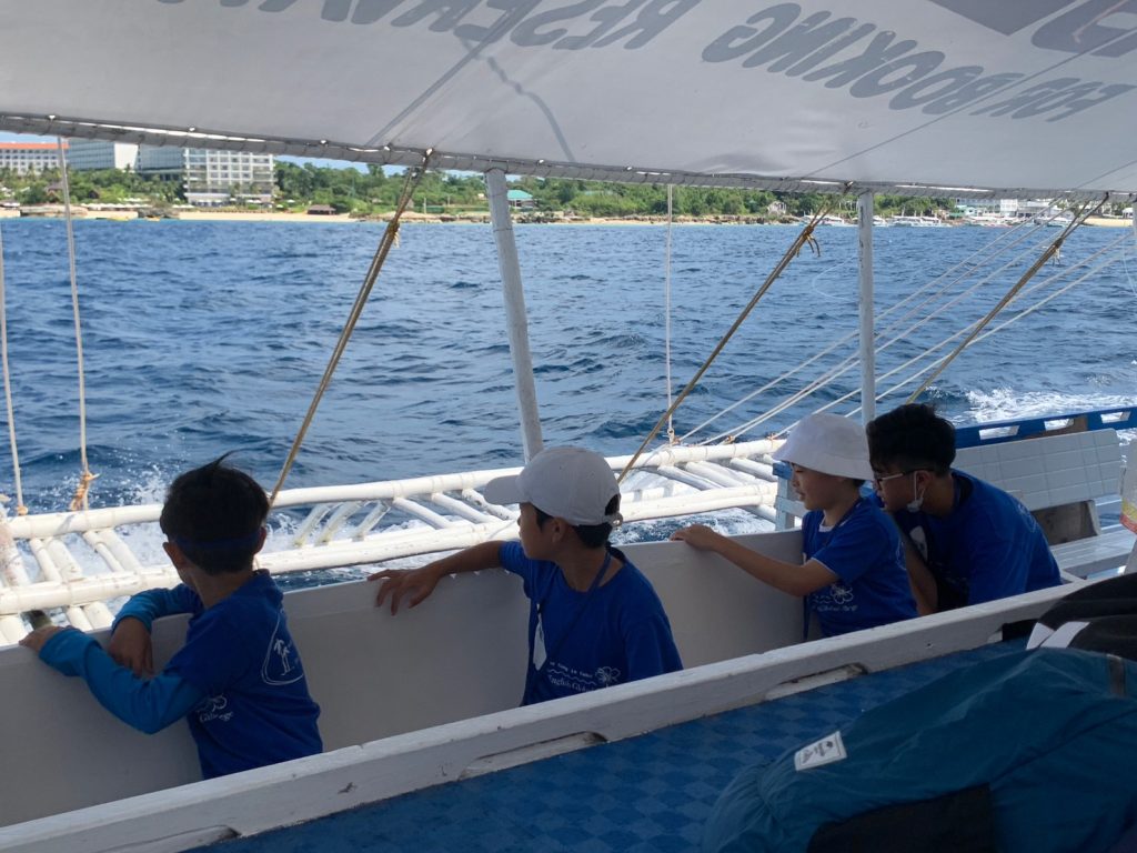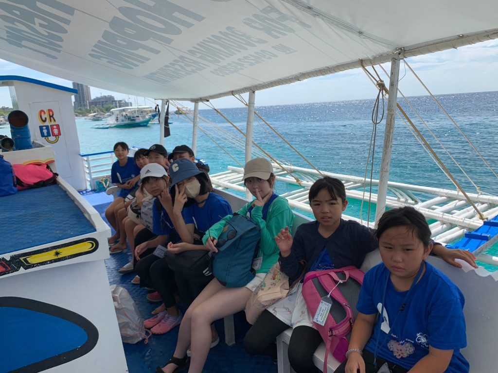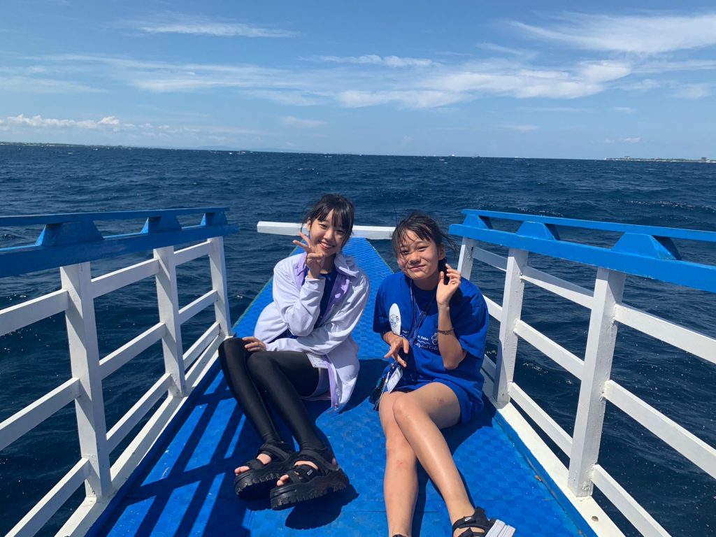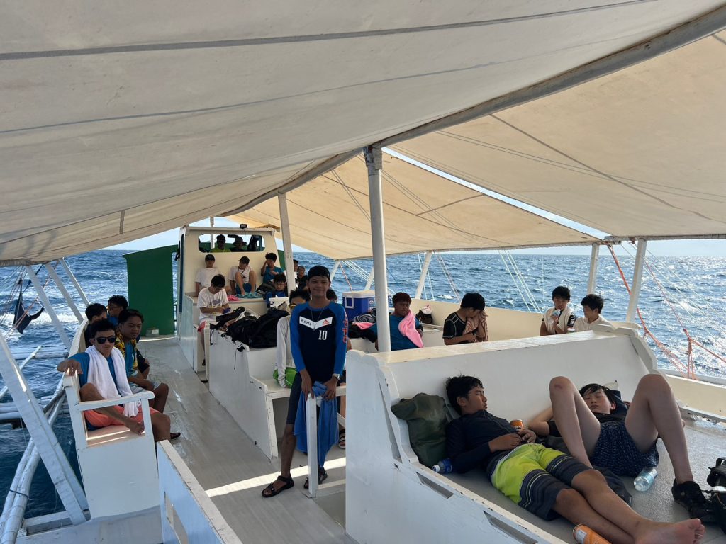 港からの移動はバンカーボートという独特の形をしたボートを使います。今日は波があるので、船がぴょんぴょん飛び跳ね、水しぶきがボートの中まで入ってきました。その揺れに最初は怖がる生徒もいましたが、慣れてくると揺れや景色を楽しむことができました。