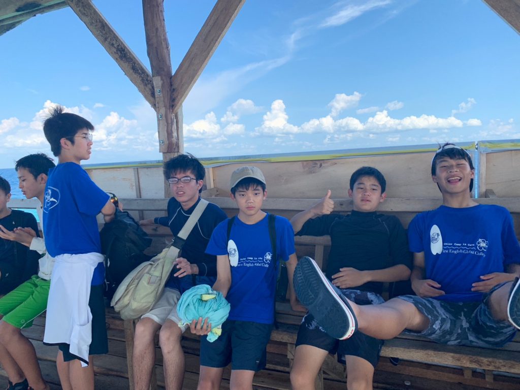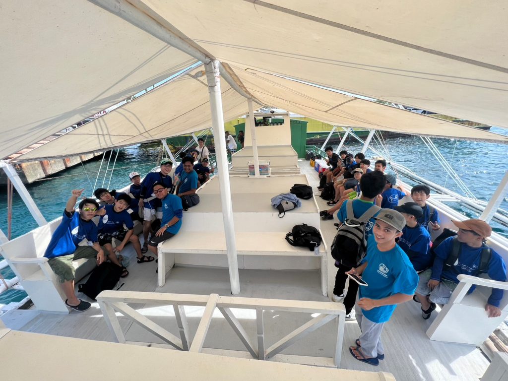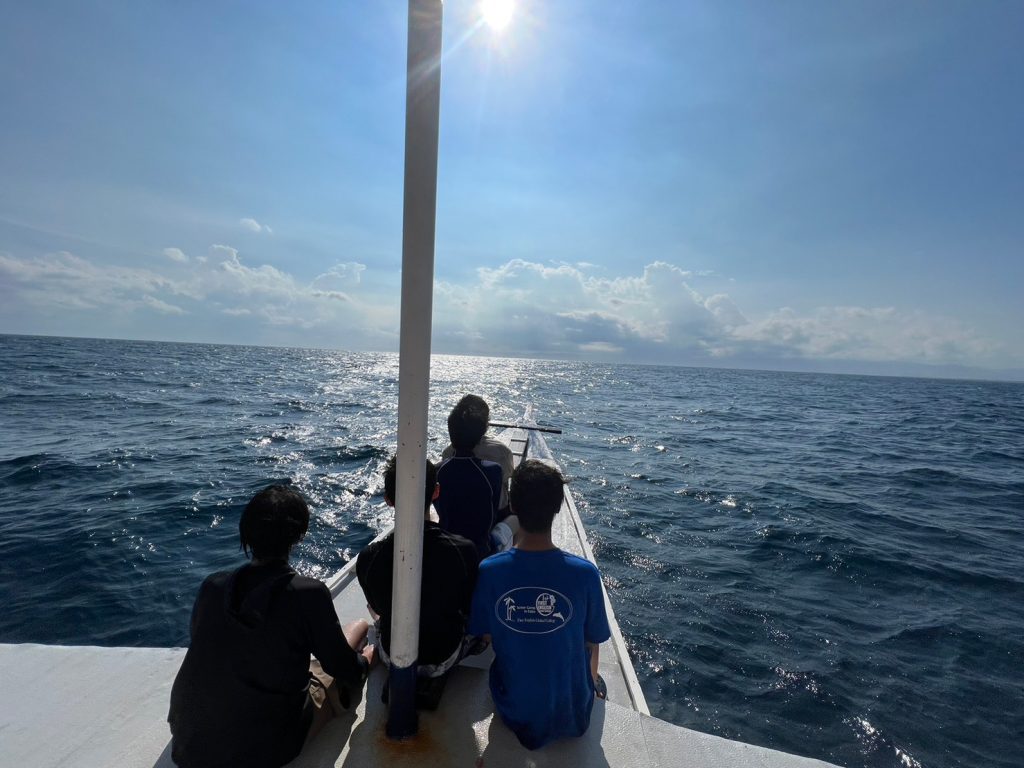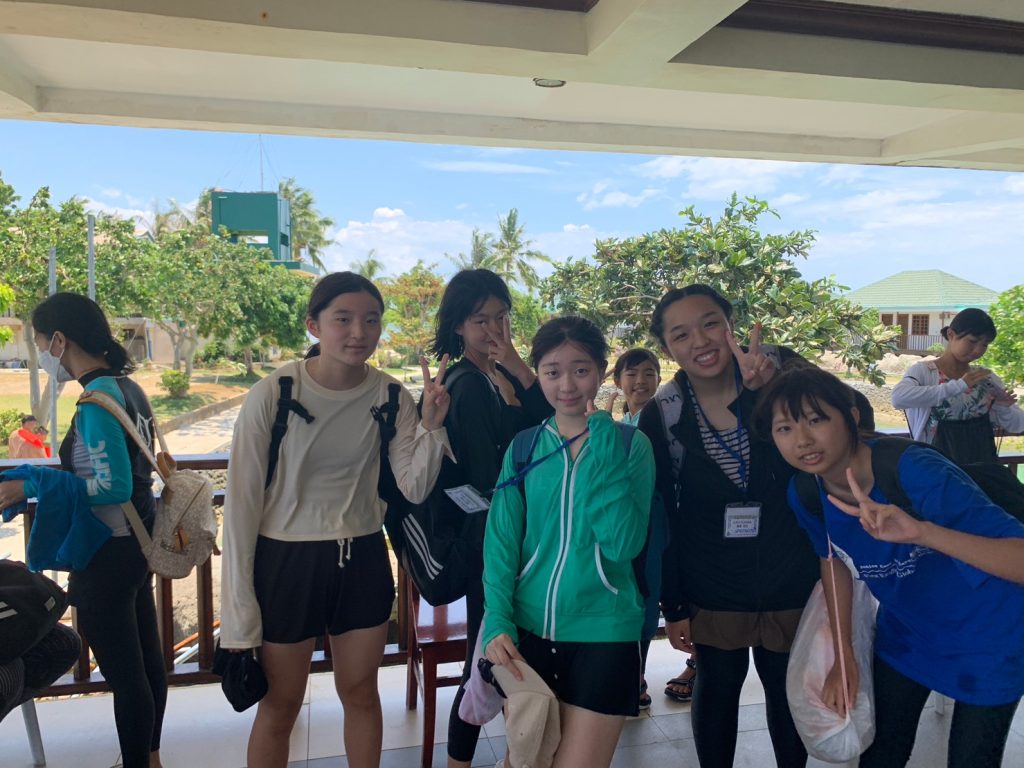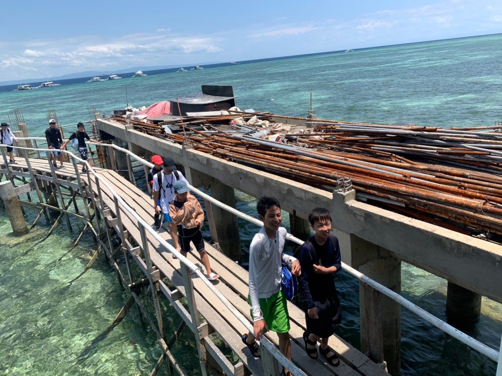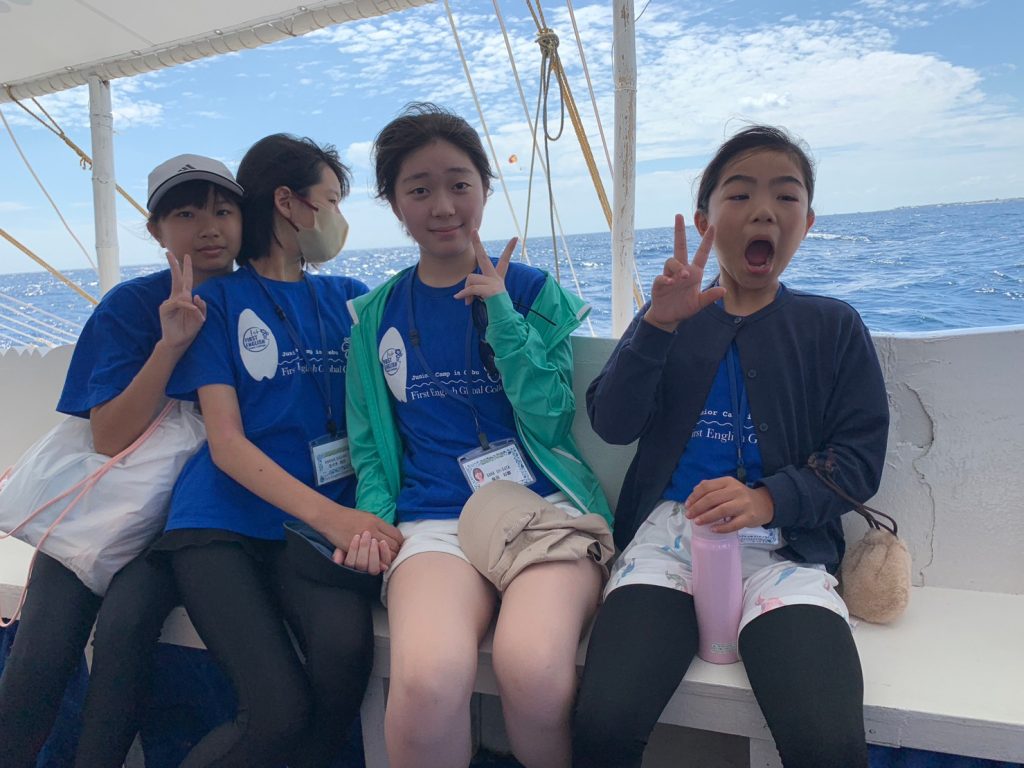 港からの移動はバンカーボートという独特の形をしたボートを使います。今日は波があるので、船がぴょんぴょん飛び跳ね、水しぶきがボートの中まで入ってきました。その揺れに最初は怖がる生徒もいましたが、慣れてくると揺れや景色を楽しむことができました。