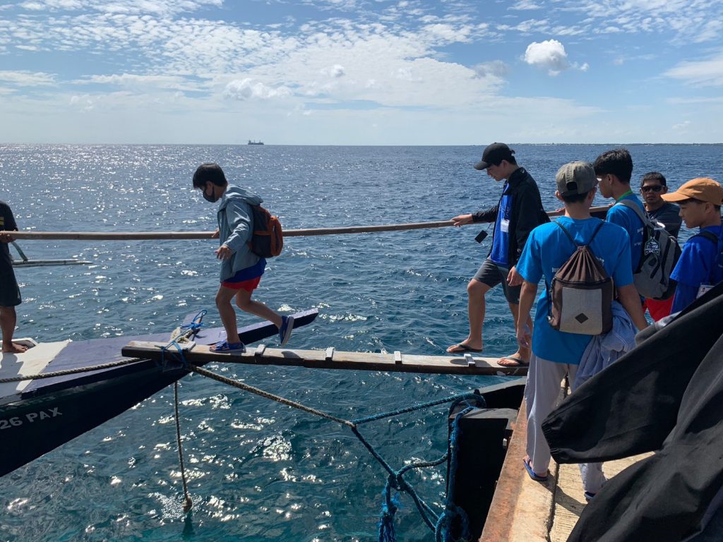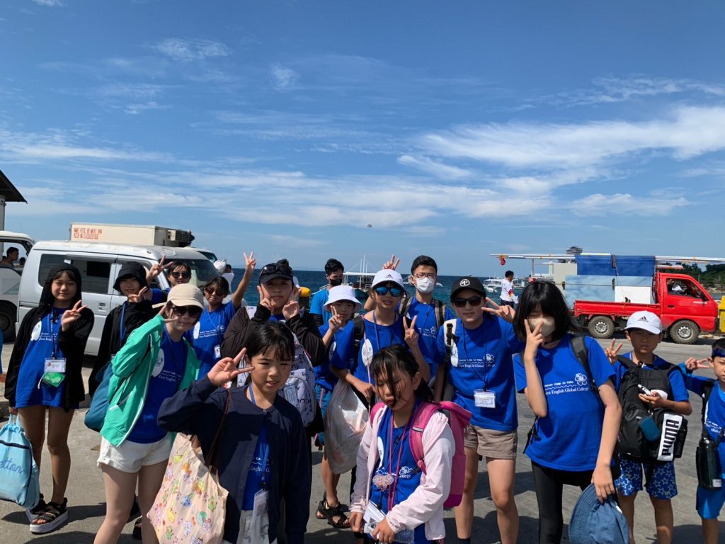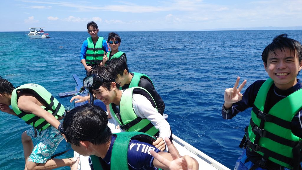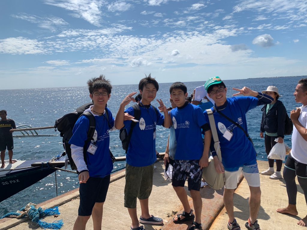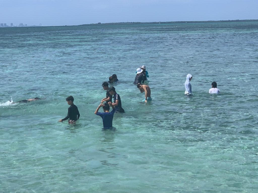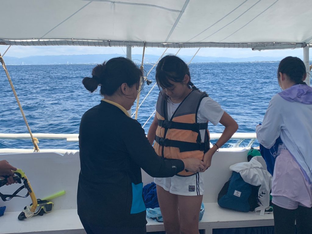 港からの移動はバンカーボートという独特の形をしたボートを使います。今日は波があるので、船がぴょんぴょん飛び跳ね、水しぶきがボートの中まで入ってきました。その揺れに最初は怖がる生徒もいましたが、慣れてくると揺れや景色を楽しむことができました。