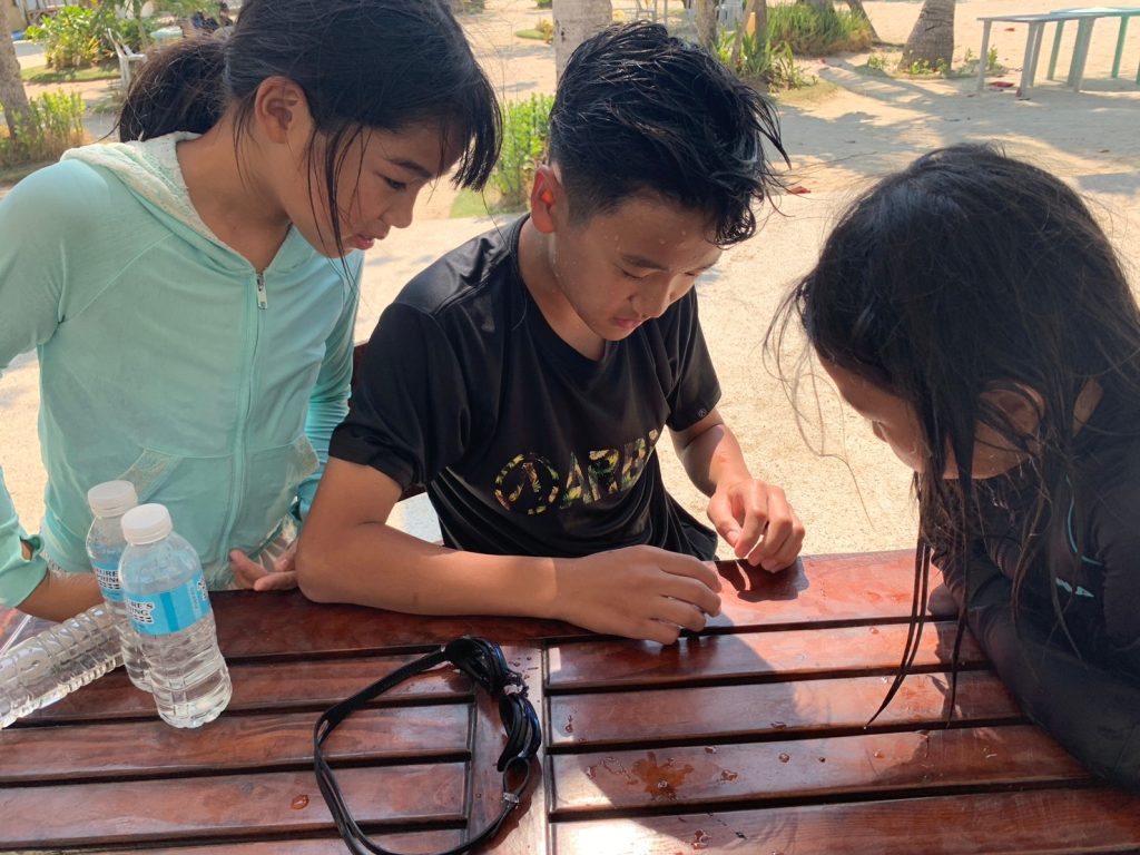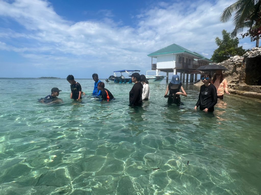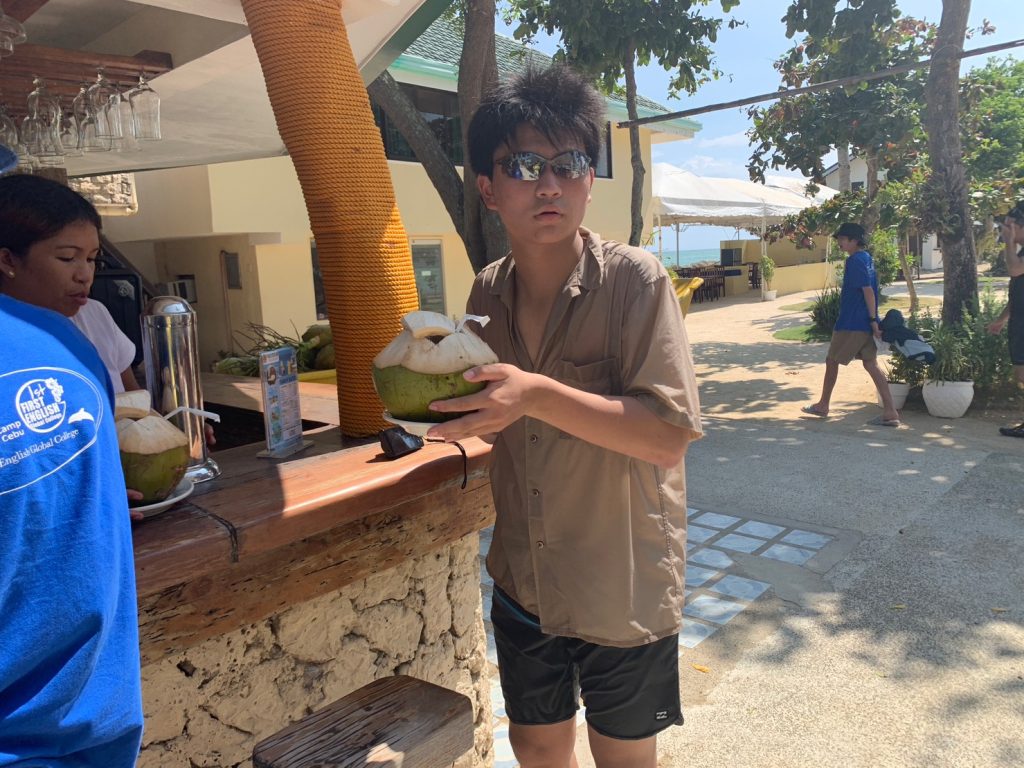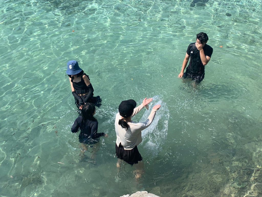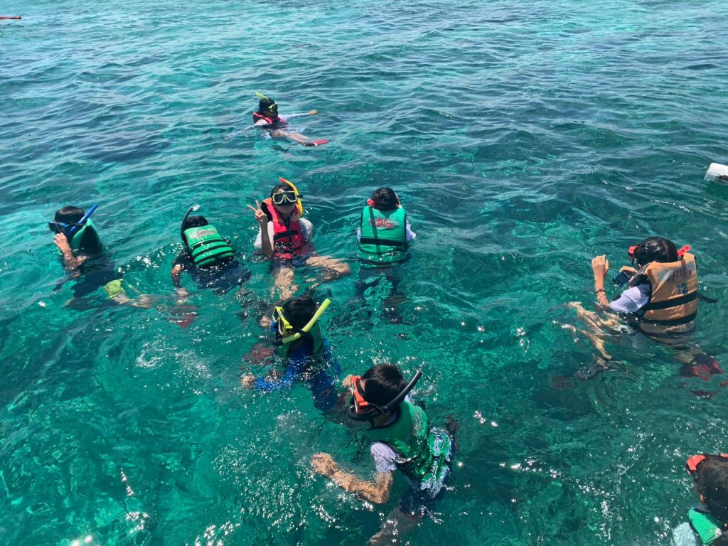 まずは集合写真を撮って、その後自由時間になります!ナルスアン島では約2時間自由時間があり、生徒たちは海で泳いだり、ショップでシェイクなどを注文したり、浜辺で休んだりしていました。