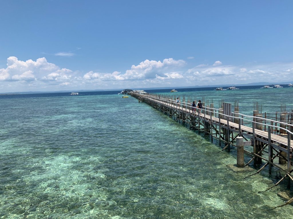 ナルスアン島周辺は遠浅の海になっているため、島から離れた場所に港があります。そこから木製の橋を渡って上陸となります。